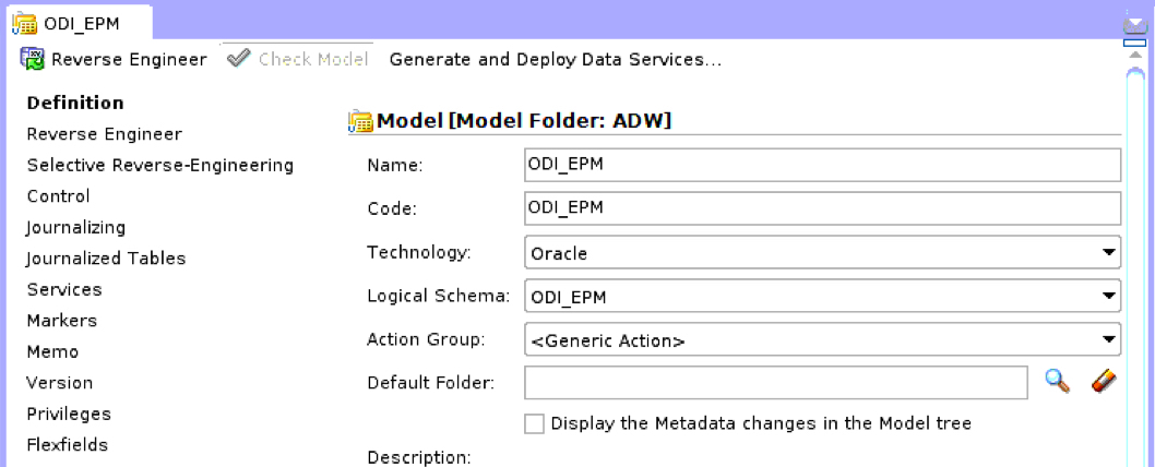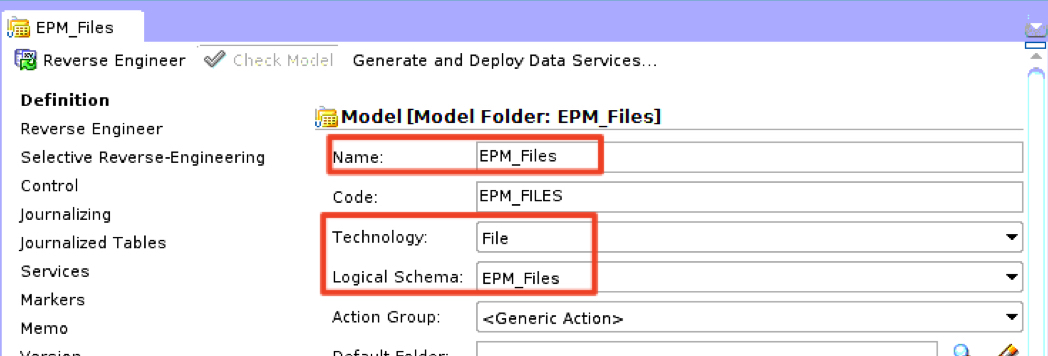 a) In ODI Designer, create a new model folder -> Create a new model. Name it EPM_Files, select File Technology and EPM_Files logical architecture: