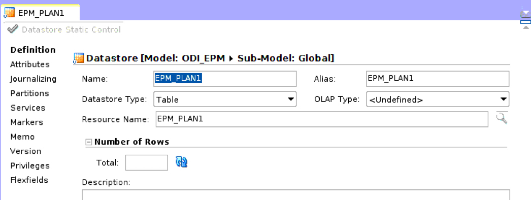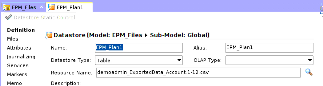 d) Rename and alias the Data store EPM_PLAN1. Enter EPM_PLAN1 in the resource name.