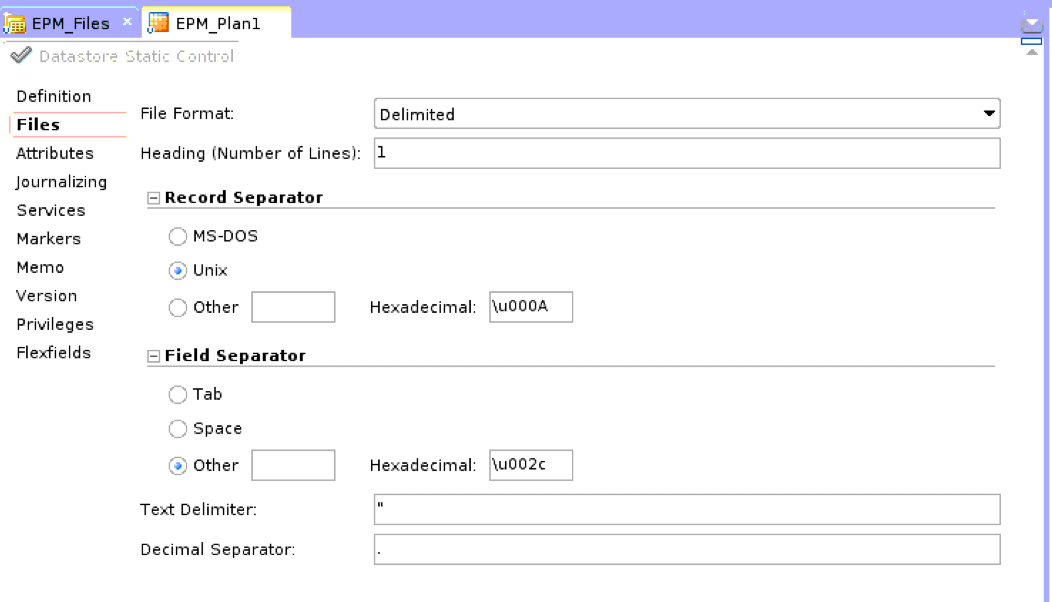 c) Click on File tab in the data store and set the delimited format, the heading to one, the record separator as Unix, the Field seperator as comma, the text delimiter as double quotes and the decimal separator as the .