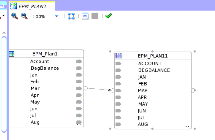 b) Drag and drop the File EPM_Plan1 datastore on the left side of the Mapping diagram. Drag and drop the ADW EPM_PLAN1 datastore on the right side of the Mapping diagram.