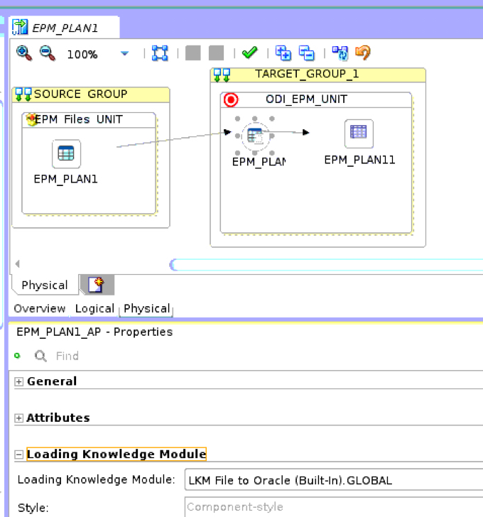 d) Click on the Physical implementation -> Select the first element in the target group. Confirm the Loading Knowledge Module is set to LKM File to Oracle (Built in).GLOBAL: