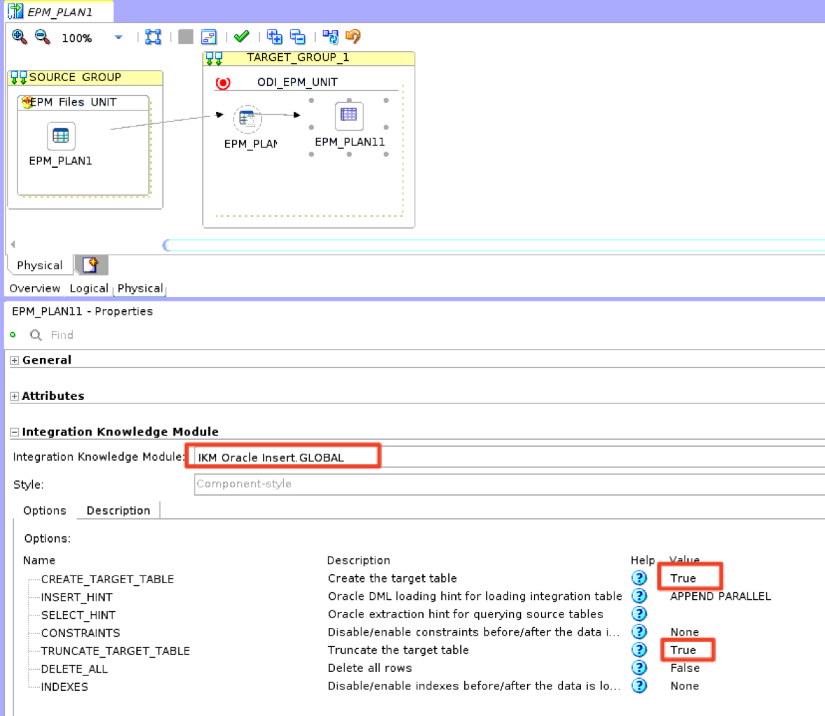 e) Select the second element in the TARGET_GROUP -> Confirm the IKM is set to IKM Oracle Insert.GLOBAL -> Ensure the CREATE_TARGET_TABLE and TRUNCATE_TARGET_TABLE options are set to true.