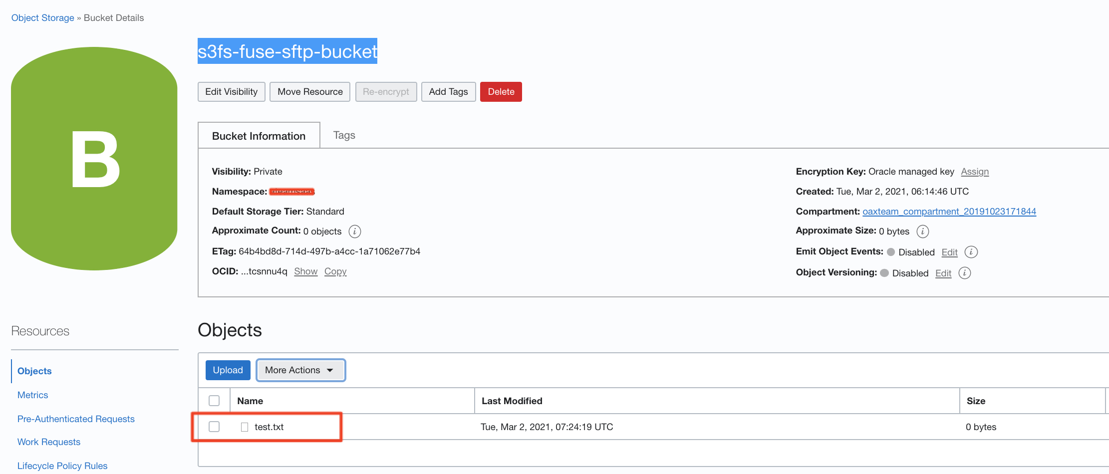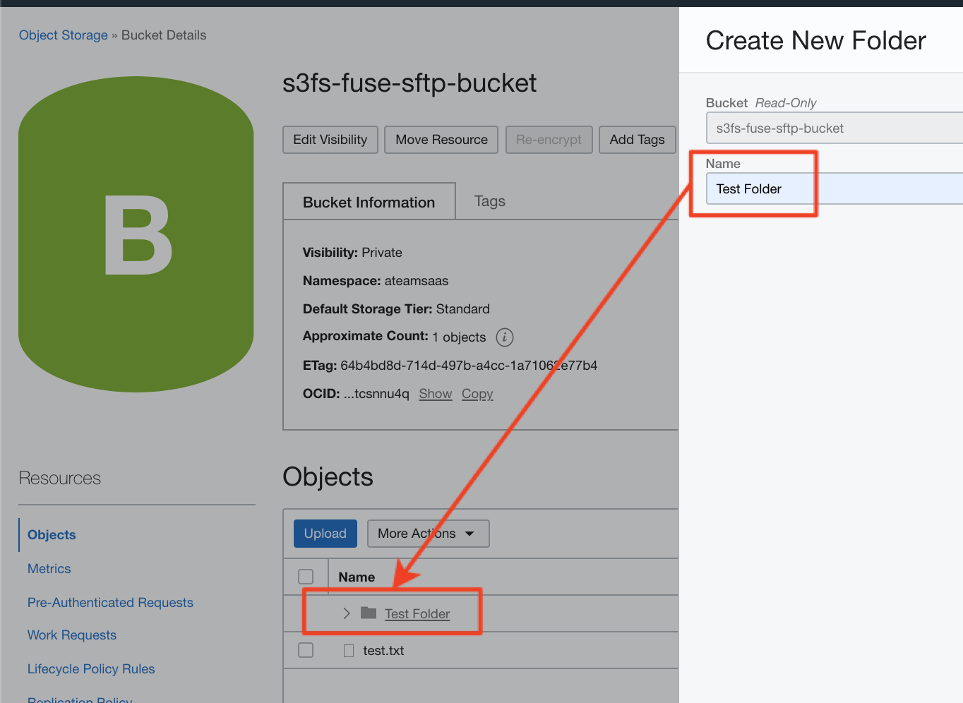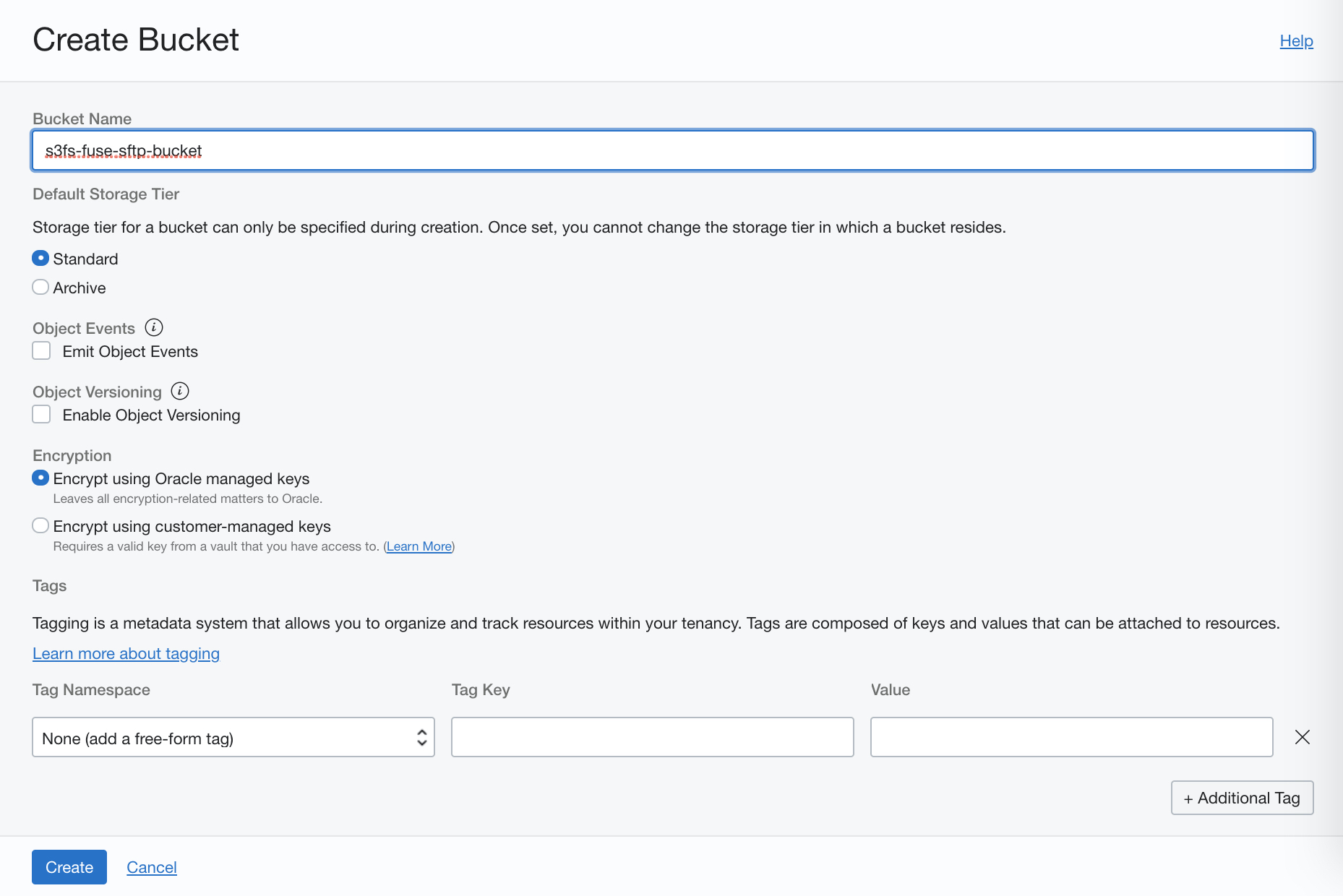 b) Create an Object Storage bucket names s3fs-fuse-sftp-bucket in the desired compartment