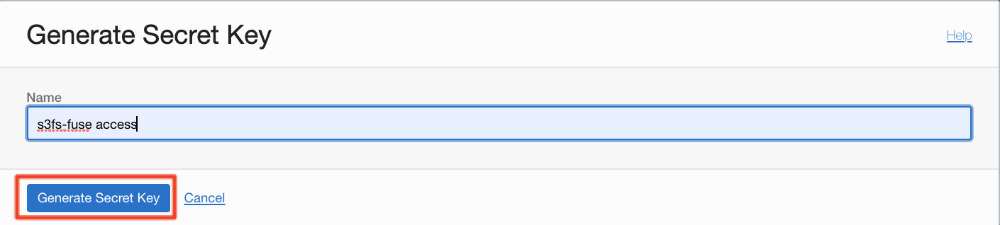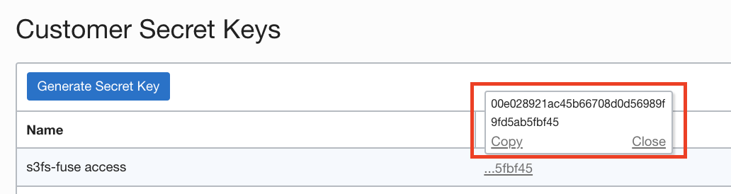 To configure the credentials for s3fs-fuse, one needs to generate a secret key for an OCI local user (not federated), update the s3fs-fuse password file and execute the s3fs-fuse mount command