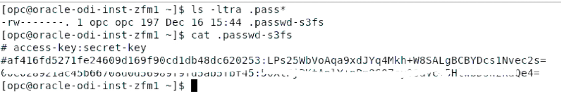 e) Connect to the ODI VM and generate the password file for s3fs-fuse using the access key and the secret key saved previously