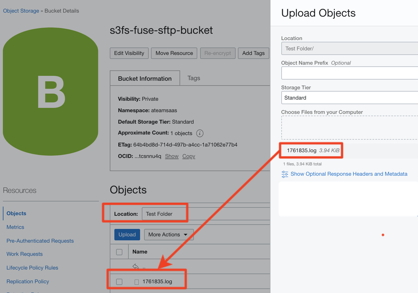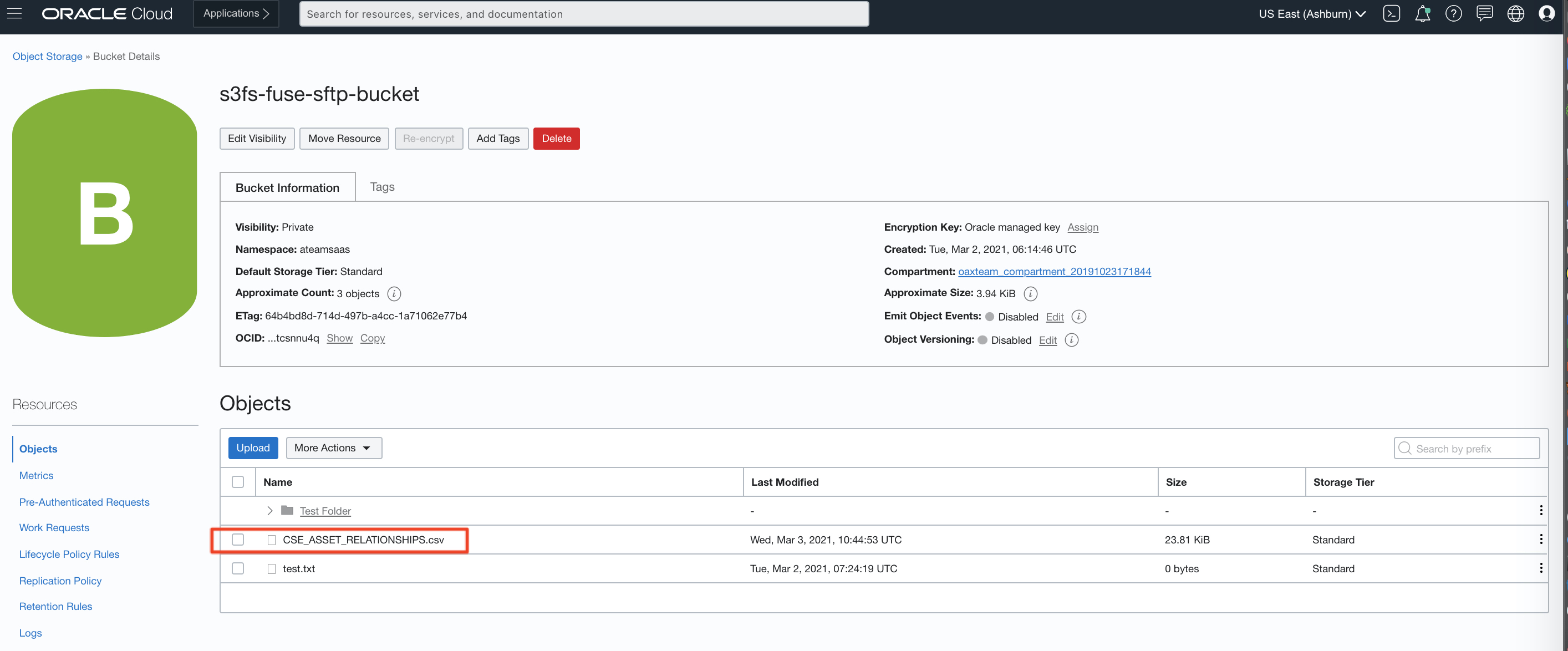 d) Access the OCI Console and look into the bucket created in the bucket mount point configuration earlier, i.e. s3fs-fuse-sftp-bucket, and validate the CSE_ASSET_RELATIONSHIPS.csv file has been generated