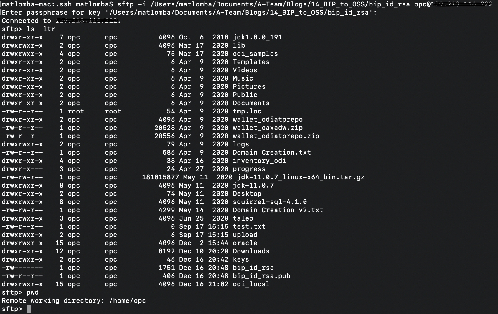 d) Copy the private key on the client and connect to sftp server on the ODI VM