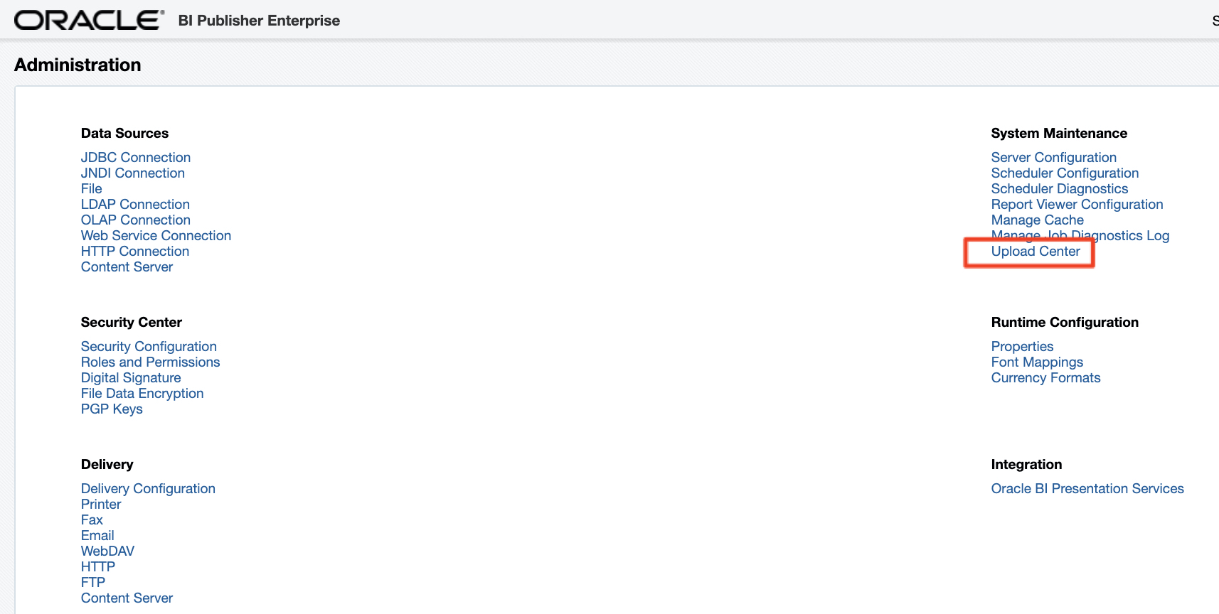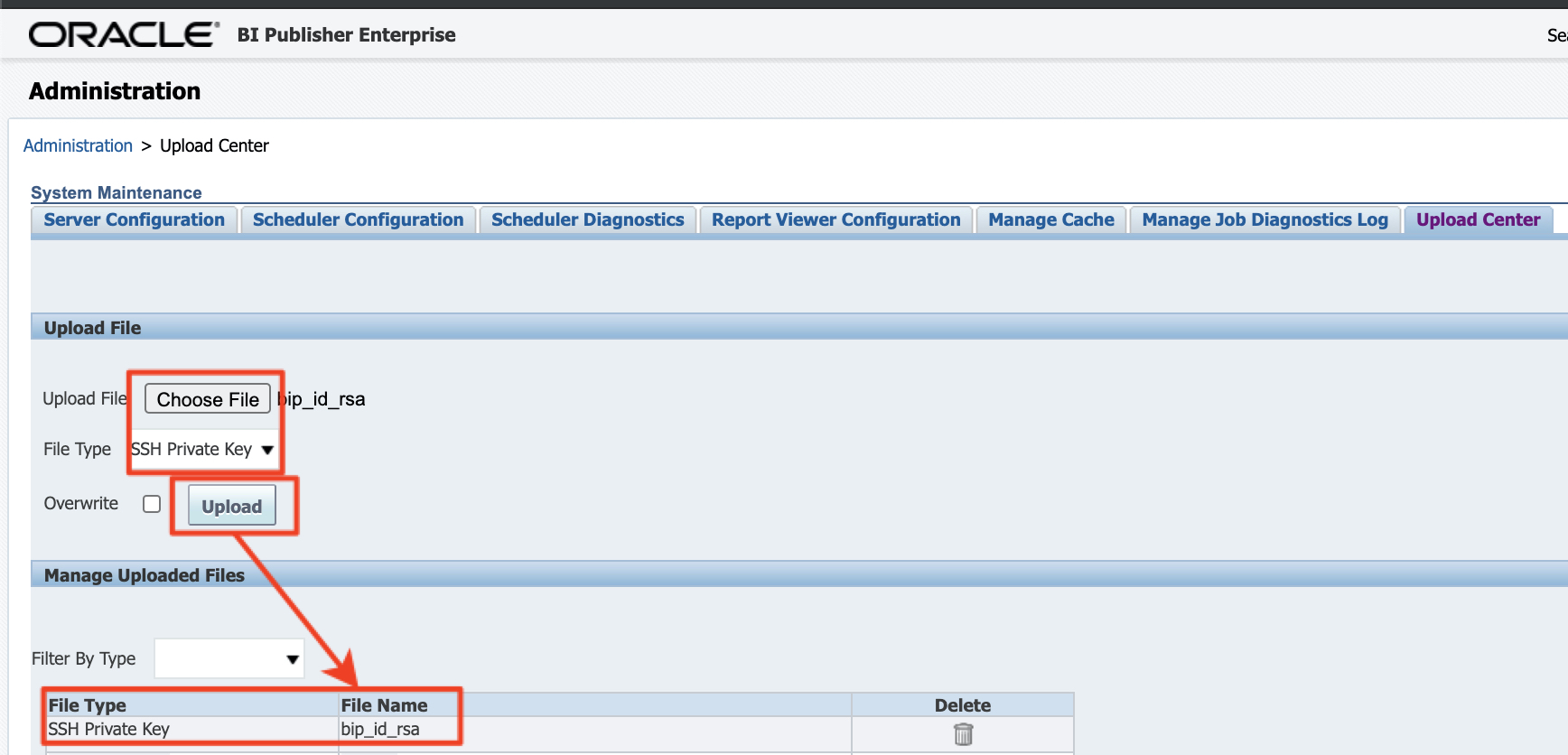 a) Connect to Fusion BI Publisher Upload Center in Administration and upload the private key bip_id_rsa