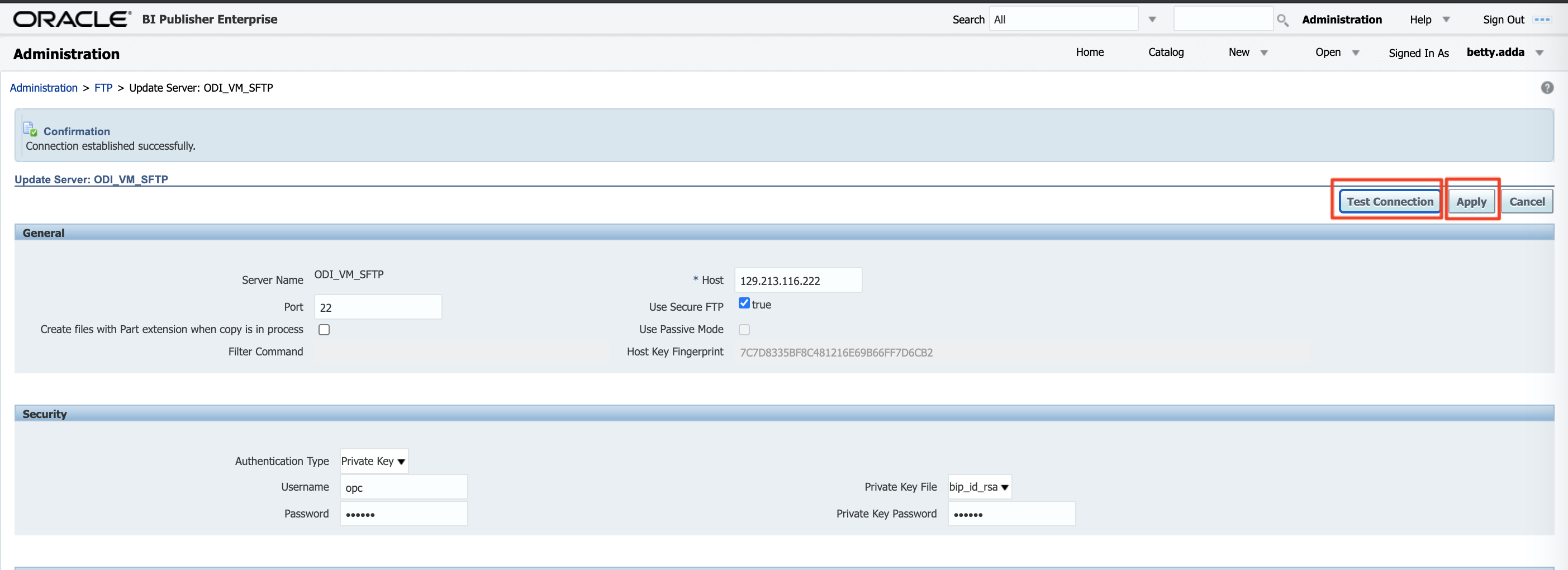 Figure 25: SFTP Server on the ODI VM configured in BI Publisher