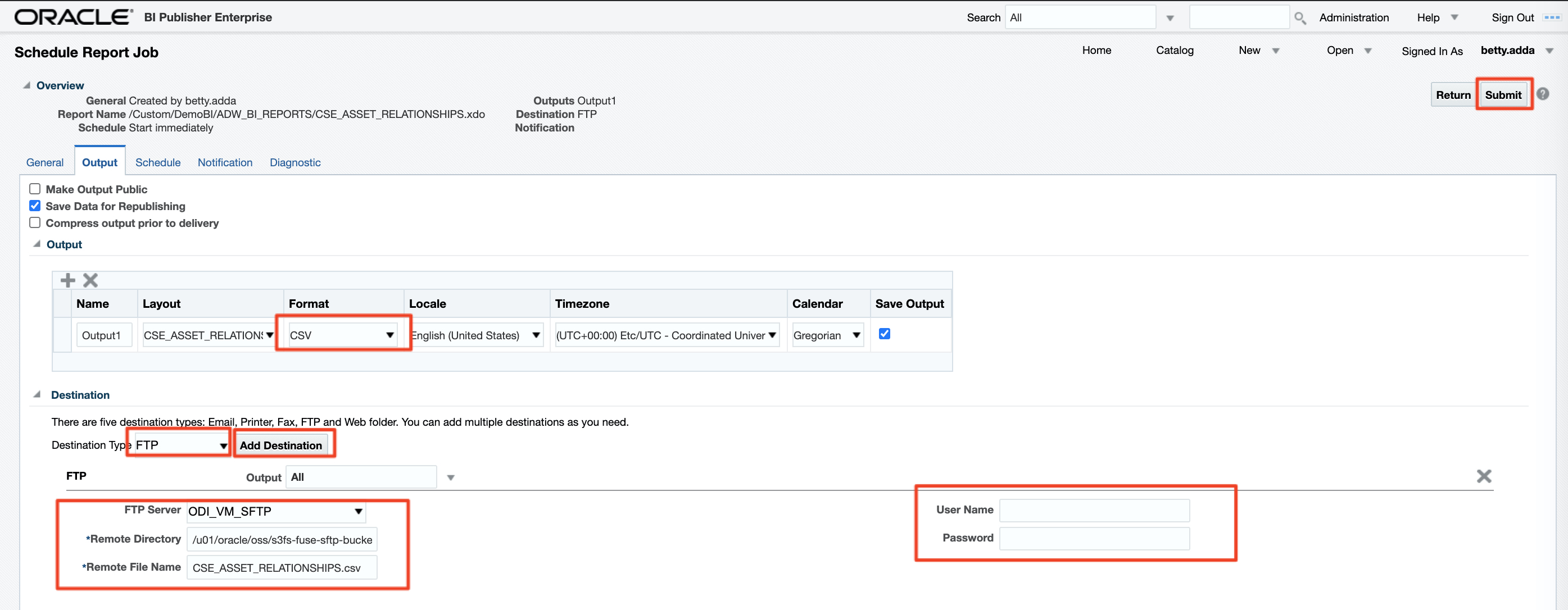 Set Up Report Options: Define Delivery Method (SFTP) and Associate Report location in BI