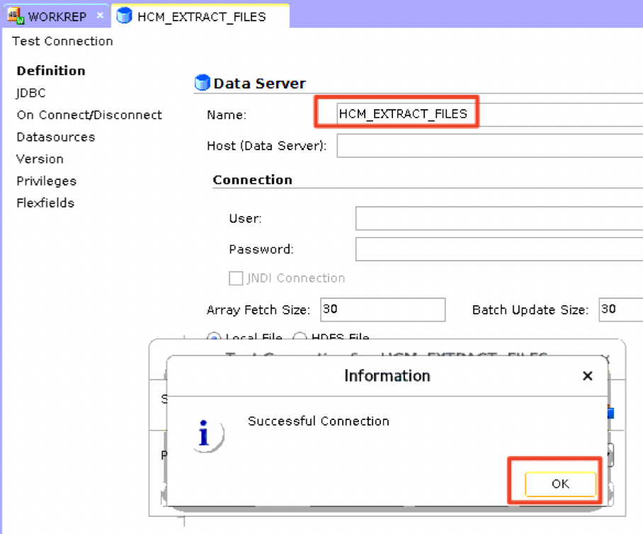 a) In Topology > Physical Architecture, create a new File Data Server and name it HCM_EXTRACT_FILES. Save -> Test the connection.
