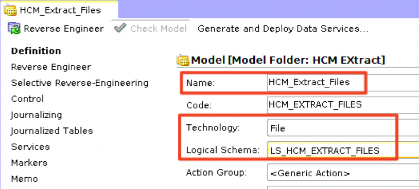 a) In ODI Designer, create a new model folder -> Create a new model. Name it HCM_Extract_Files, select File Technology and LS_HCM_EXTRACT_FILES logical architecture:
