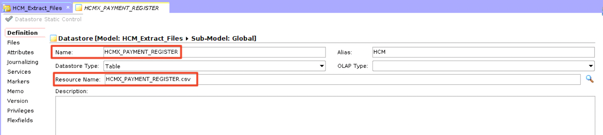 d) Rename and alias the Data store HCMX_PAYMENT_REGISTER. Enter HCMX_PAYMENT_REGISTER in the resource name and in the Alias.