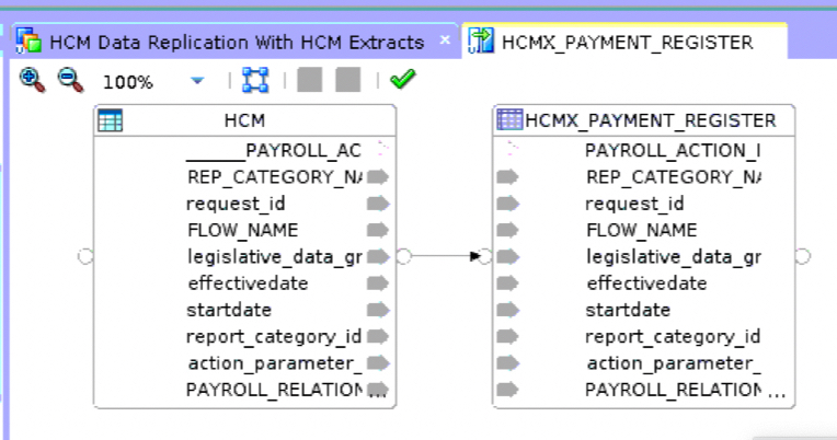 b) Drag and drop the File HCMX_PAYMENT_REGISTER datastore on the left side of the Mapping diagram. Drag and drop the ADW HCMX_PAYMENT_REGISTER datastore on the right side of the Mapping diagram.