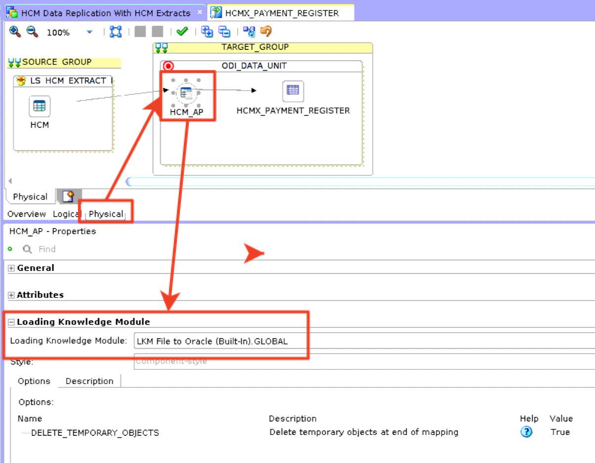d) Click on the Physical implementation -> Select the first element in the target group. Confirm the Loading Knowledge Module is set to LKM File to Oracle (Built in).GLOBAL: