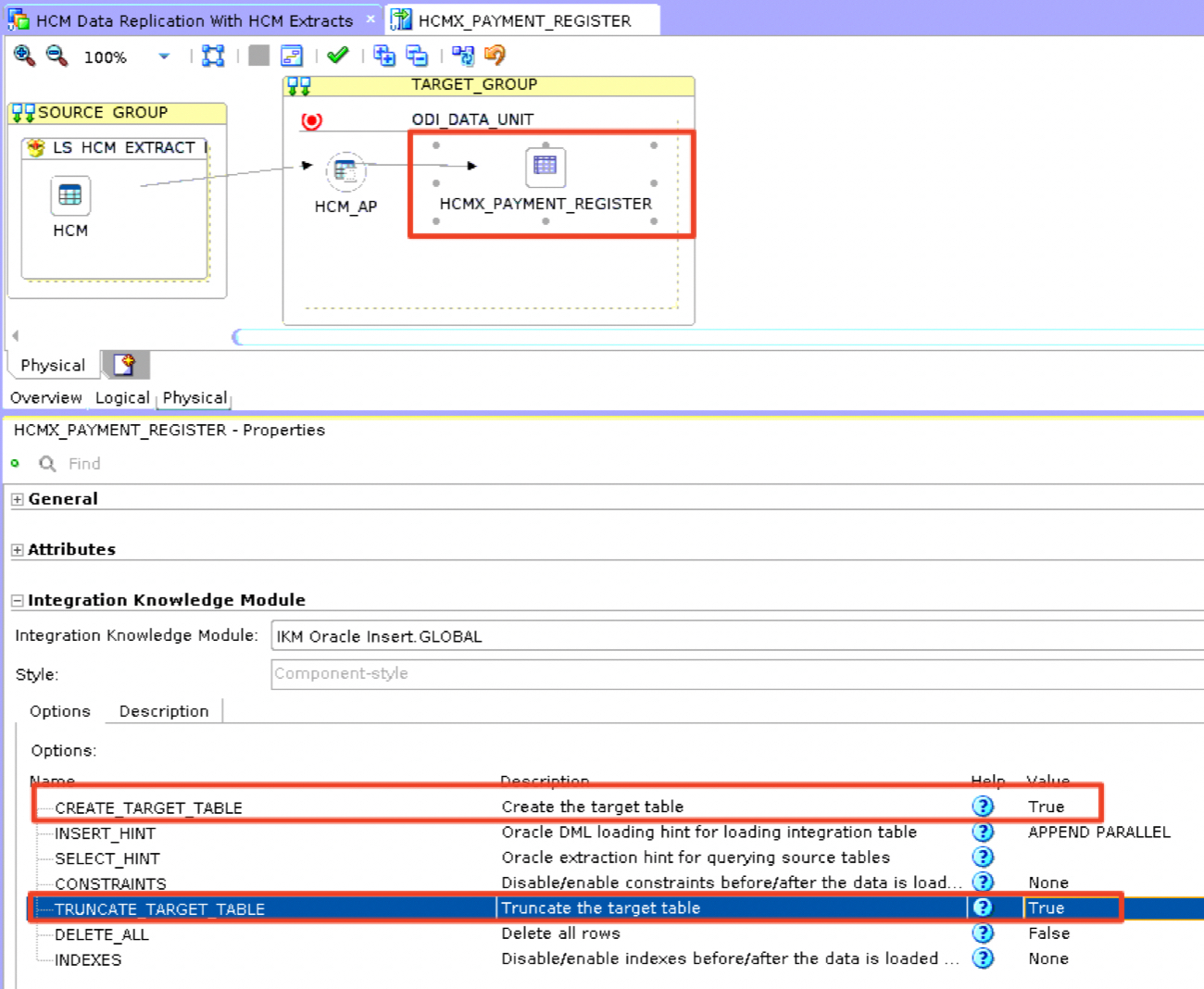 e) Select the second element in the TARGET_GROUP -> Confirm the IKM is set to IKM Oracle Insert.GLOBAL -> Ensure the CREATE_TARGET_TABLE and TRUNCATE_TARGET_TABLE options are set to true.
