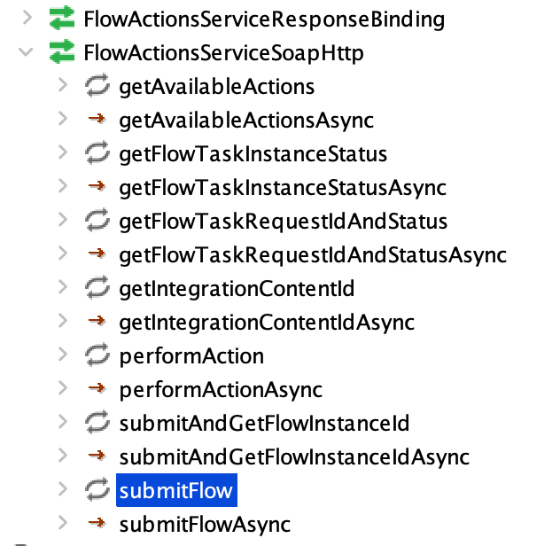 The FlowActionServices endpoint follows this syntax https://<Fusion SaaS hostname>:443/hcmService/FlowActionsService. When opening this endpoint with a SOAP client like SOAPUI, below is the content of the available methods