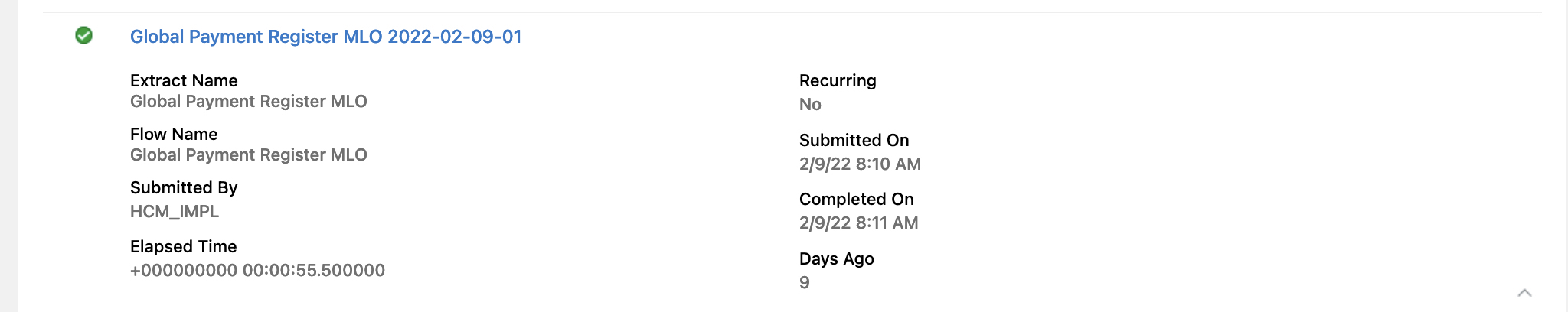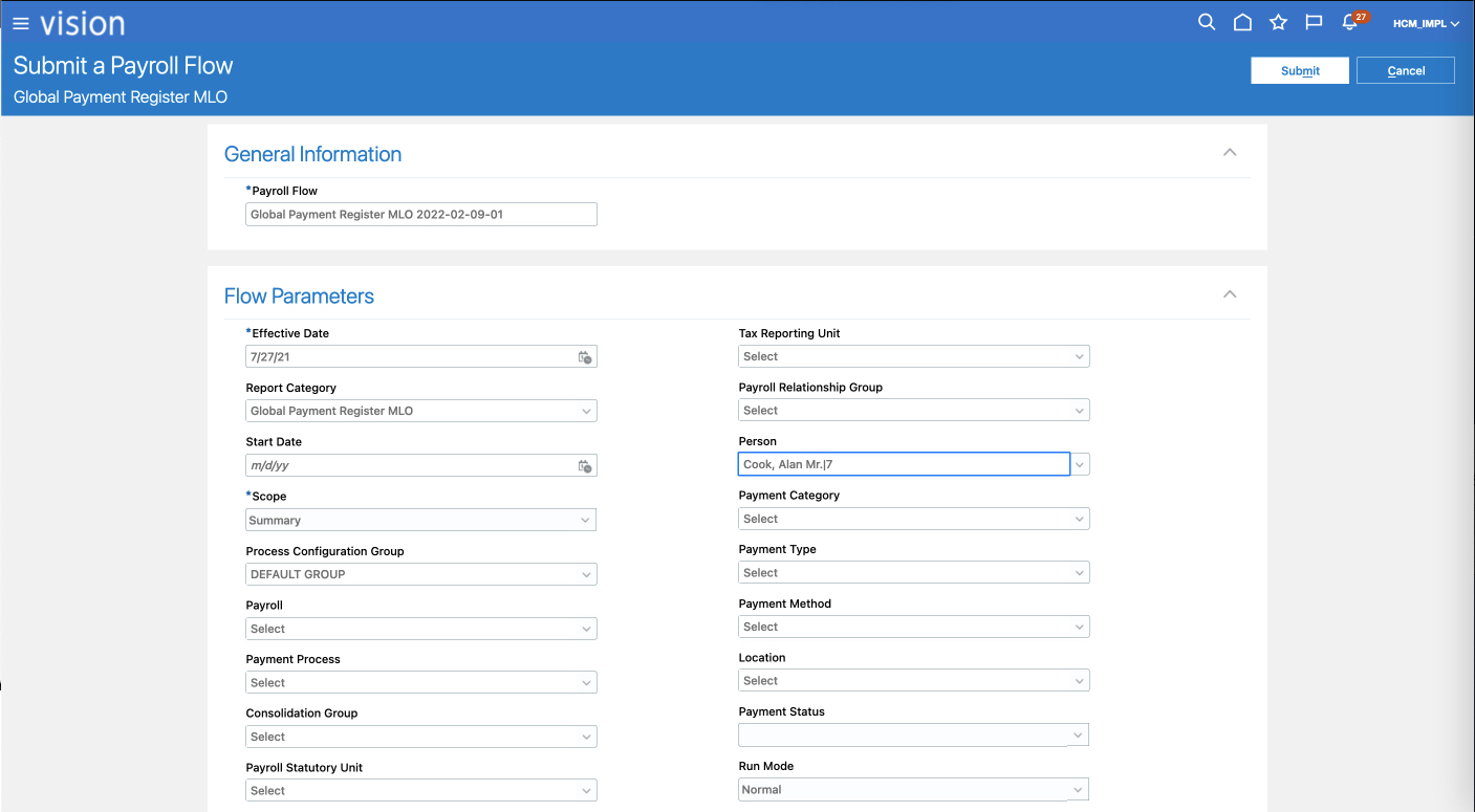 a) In Fusion Application, navigate to My Clients Groups > Payroll. Choose Submit a Flow and select the HCM Extract Global Payment Register. Give the Payroll Flow a unique name and enter the Flow parameters as described below