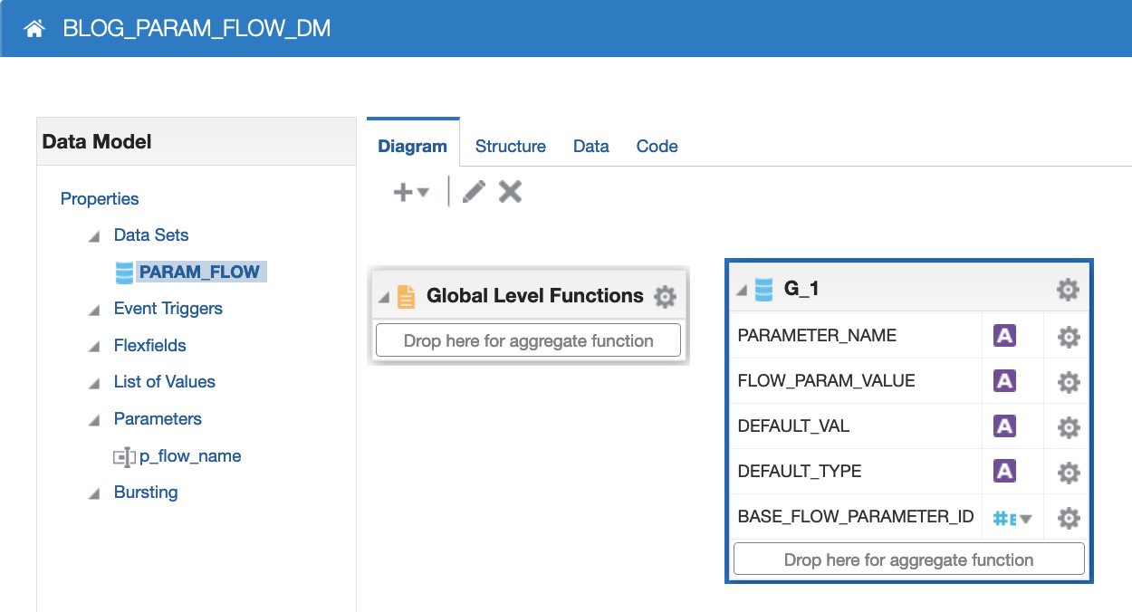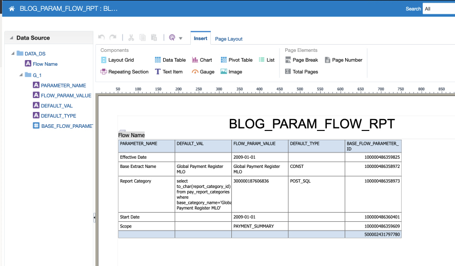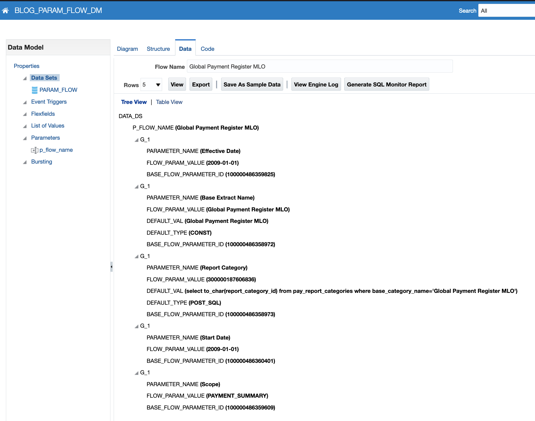 a) Access the Fusion Application BI Publisher tool and create a new data model with the below query. Make sure to create the p_flow_name BI Publisher parameter of type String and to save sample data for the BI Publisher Data Model