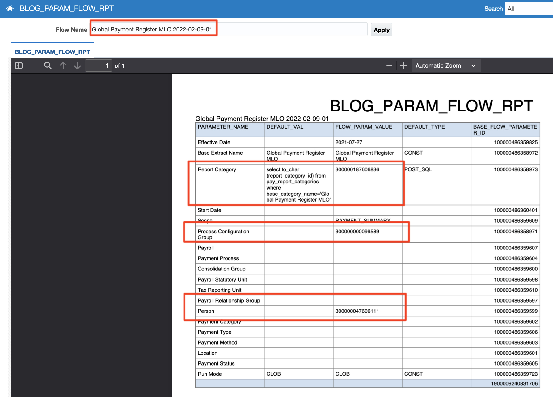 select fp.parameter_name,pv.flow_param_value, fp.default_val,fp.default_type, fp.base_flow_parameter_id from pay_flow_instances fi, pay_flows_vl f, pay_flow_parameters_vl fp, pay_flow_param_values pvwhere f.base_flow_id = fi.base_flow_id and fp.base_flow_id = f.base_flow_id and pv.flow_instance_id = fi.flow_instance_id and fp.base_flow_parameter_id = pv.base_flow_parameter_id and fi.instance_name = :p_flow_name