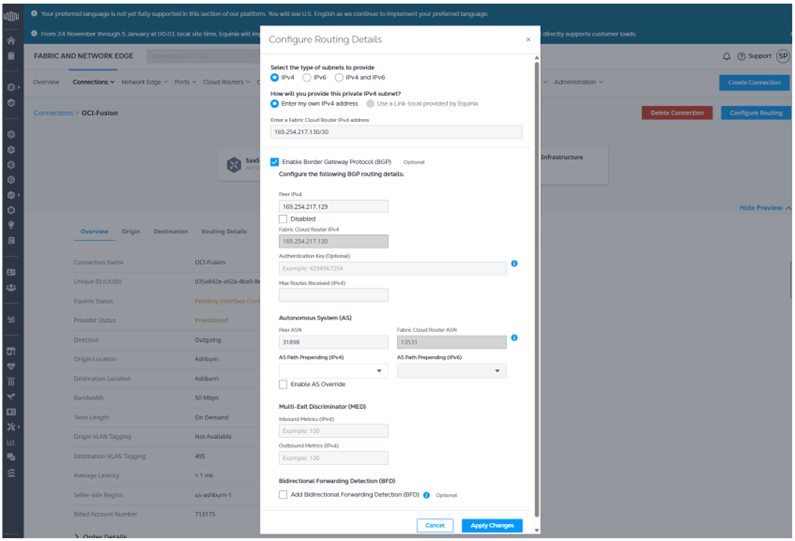 • Configure Equinix end IP and Peer IP (We can get these public IP from fastconnect status page at OCI)