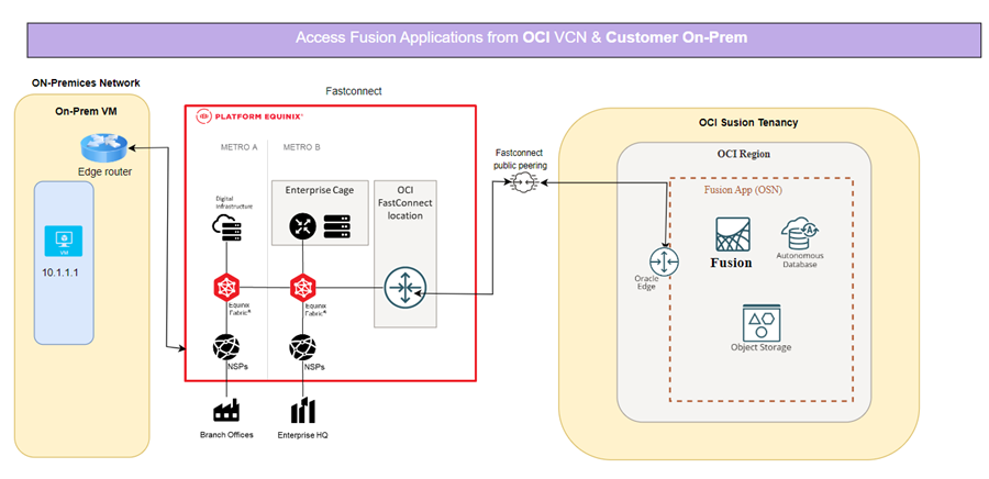 • Secure access path from on-premises → Equinix Fabric → FastConnect → Fusion Cloud Applications