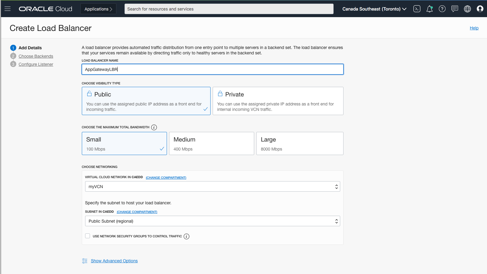 Lets setup a basic public load balancer. Here I selected a Small Public Load Banancer using my existing VCN and public subnet.