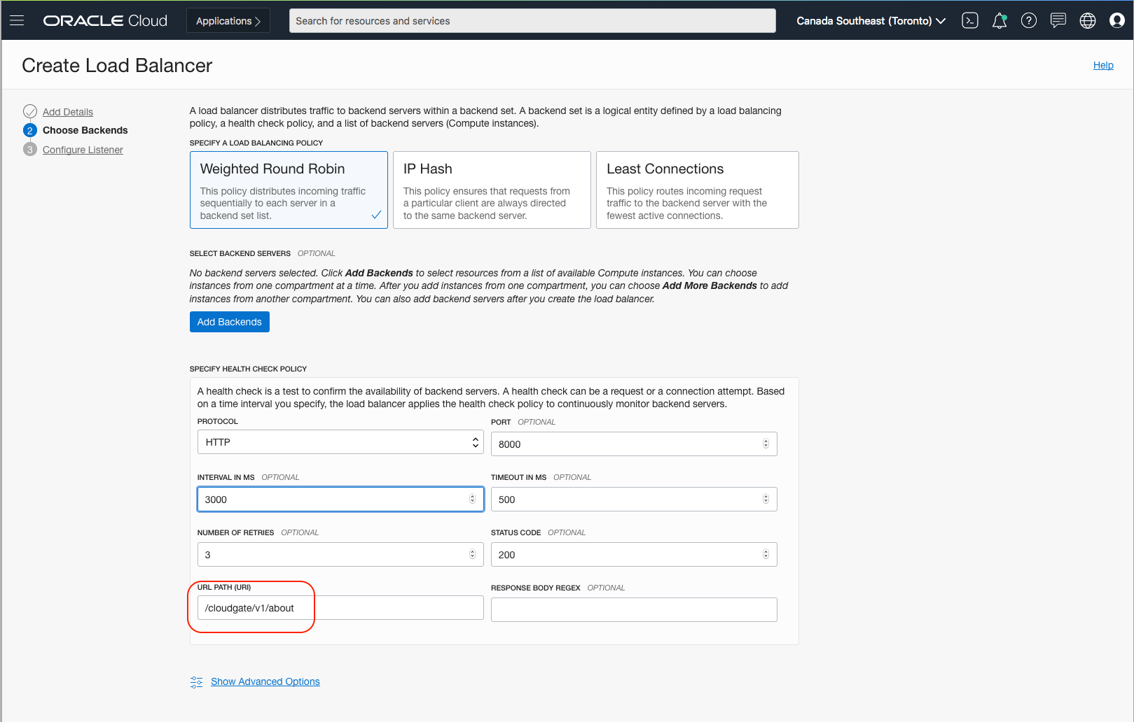 On the Choose Backends screen, add the backend compute nodes you created for App Gateway or you can do this later once the LBR is created. Notice the URL Path for the health check; this URL should return a HTTP status code of 200. That is how the Load Balancer knows the state of the App Gateway appliance.