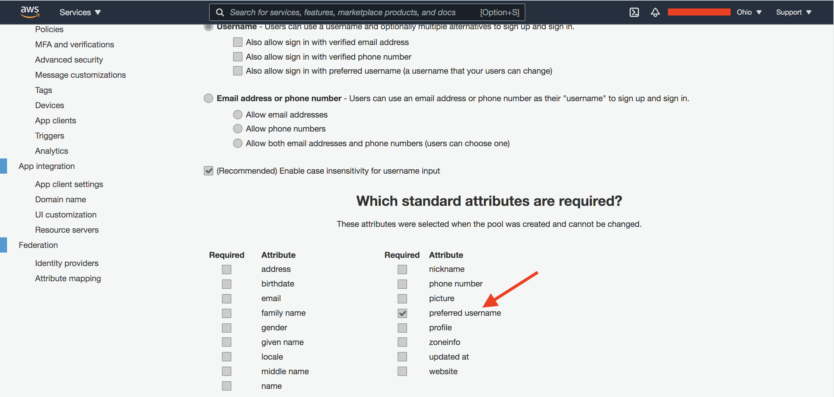 By default, IDCS requires users to have email. This is not surprising since many use cases, especially in the corporate environments, require users to have emails. However, increasingly applications and identity providers do not require email as a required attribute for user accounts. For example, in AWS I have defined the following attribute section for our example provider Amit Cognito.