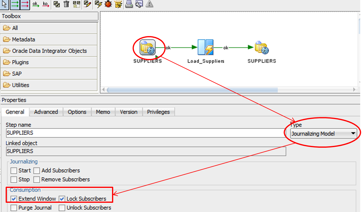 To add these operations to a package, drag and drop the Model that contains the CDC set, then set the Type to Journalizing Model and select the appropriate options in the consumption section, as shown in Figure 10. You can drag and drop the model twice to separate the two operations.  Note that in this case, the Extend Window operation must be done before the Lock Subscriber operation.