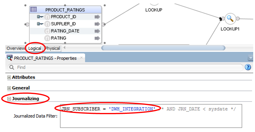 The code generated by ODI uses this view instead of the original source table when this option is selected. The JV$ view joins the J$ table with the source table on the primary key. A filter in Logical tab of the mappings allows the developers to select the subscriber for which the changes are consumed, as illustrated in figure 5 below: