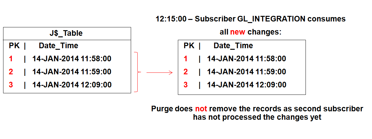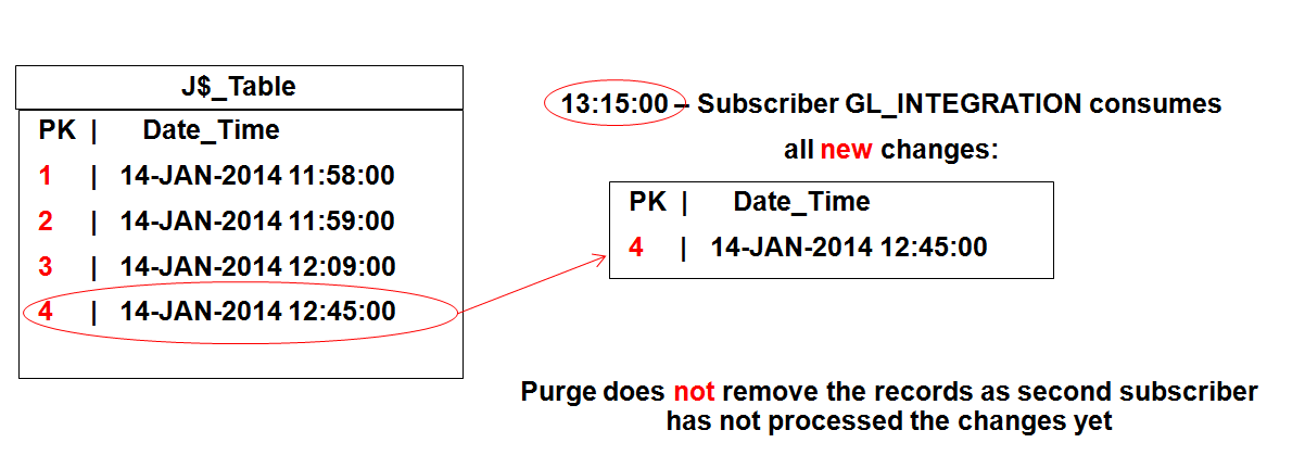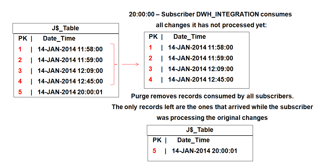 ODI also maintains a list of subscribers to the changes the same way messaging systems work: each target application that requires a copy of the changes can be assigned a subscriber name. When consuming the changes, applications filter the changes by each providing their own subscriber name. In that case, when performing a purge, only the changes processed by all subscribers are removed from the J$ table (in other words, as long as at least one subscriber has not consumed a changed record, that record remains in the J$ table). Different subscribers can safely consume changes at their own pace with no risk of missing changes when they are ready for their own integration cycle. Figures 1 to 3 illustrate the consumption by 2 subscribers with different integration cycles and shows how purges are handled.